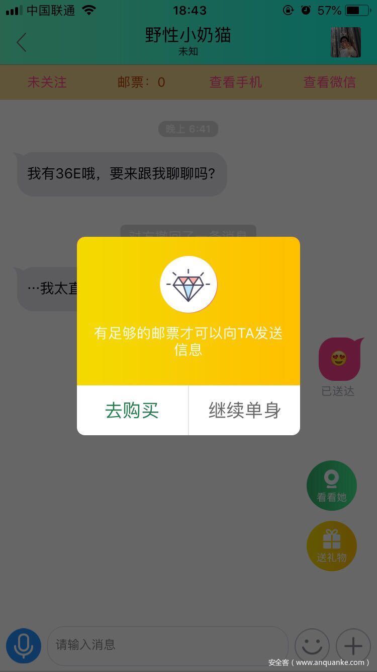 继续跟这个女生聊天,消息刚发,便弹出一个弹窗,提示要购买“邮票”,才能继续聊天,否则,就要“继续单身”。而邮票最低付费68元。想想银行卡里的两位数储蓄,我有所犹豫,退出这个聊天窗口。