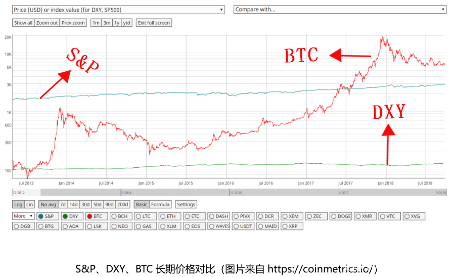 “虚拟货币”市场继承了传统金融市场的种种风险,但是在具体程度上又有所区别。通过对2013年4月末至2018年9月标准普尔指数(S&P)、美元指数(DXY)、比特币(BTC)三者的价格监测发现“虚拟货币”波动程度远高于另外两者。
