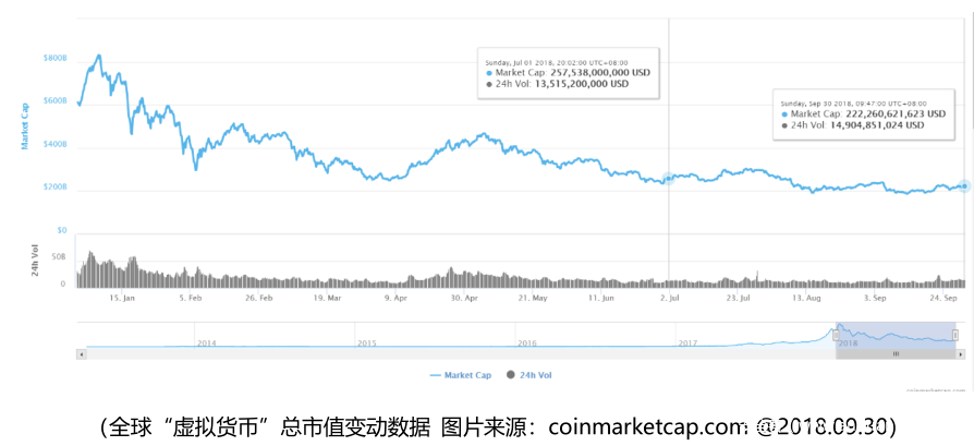 2018年7月1日至2018年9月30日三个月期间,全球“虚拟货币”的总市值持续5月以来的低迷,总体依然呈现下跌趋势。
