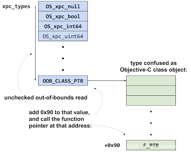 沙箱逃逸漏洞是libxpc中比较严重的安全性问题,其中重构将导致一个<边界检查变为与边界值的!=比较。被检查的值是直接从IPC消息中读取的,用于索引数组以获取函数指针。