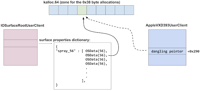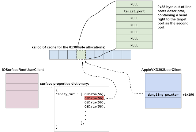 现在,攻击者重新创建了在IOSurface漏洞利用中的相同情况:即将获得一个悬空的mach端口指针,但来自于截然不同的初始原语。在这种情况下,漏洞本身就给他们一个指向mach端口结构的悬空指针。在这里,从不同区域的重复释放漏洞中重新创建了相同的原语,这是有所不同的地方。