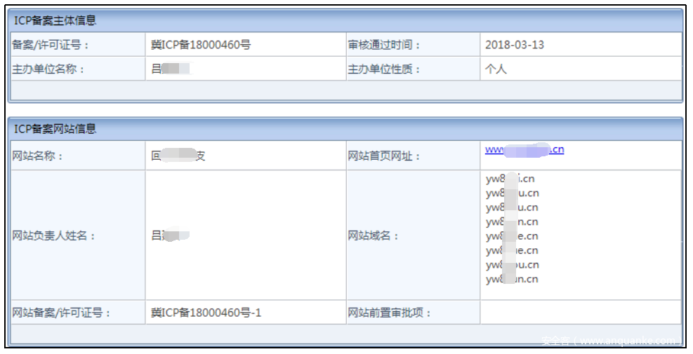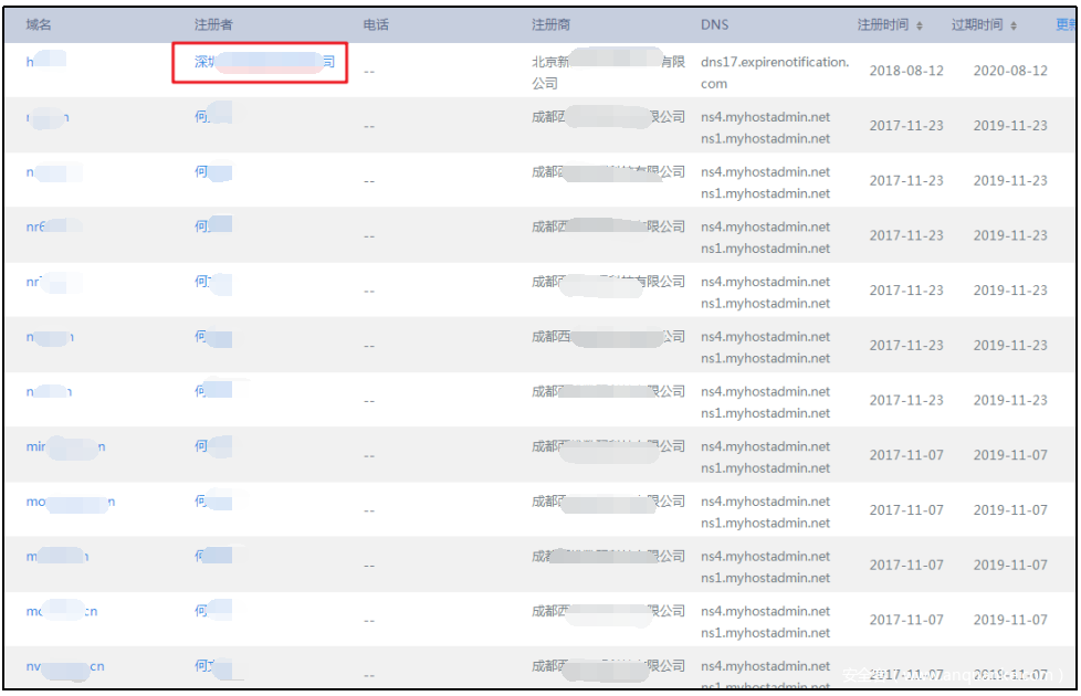 通过联系人反查和联系邮箱反查,分别可以查询到11个和12个域名,其中通过联系邮箱反查获取到域名如下: