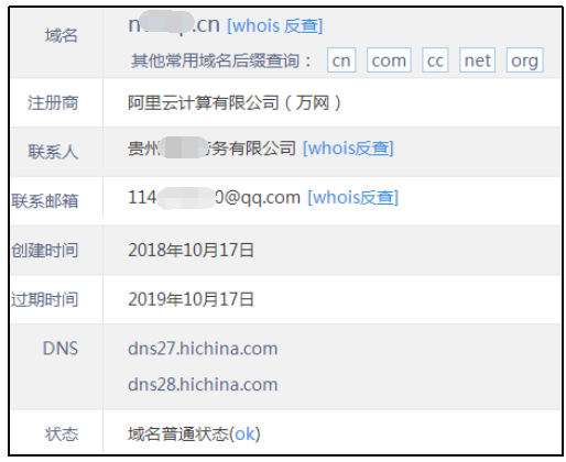 通过whois查询域名信息可知,该域名的联系人为贵州**劳务有限公司,联系邮箱为114****020@qq.com。