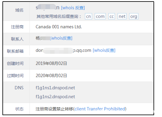 通过whois查询可知该域名的联系人为杨**,联系邮箱为dom***rotect@vip.qq.com。
