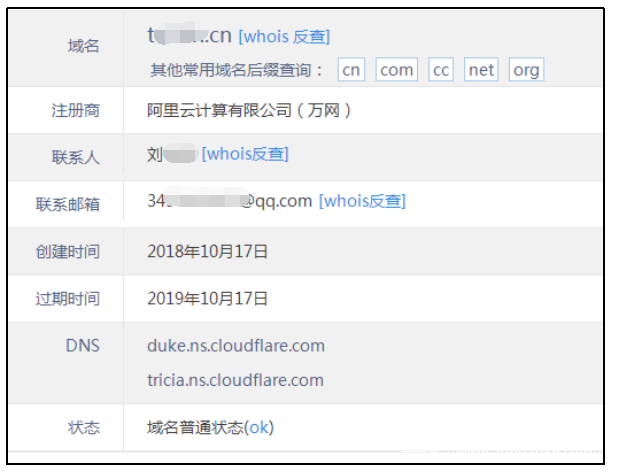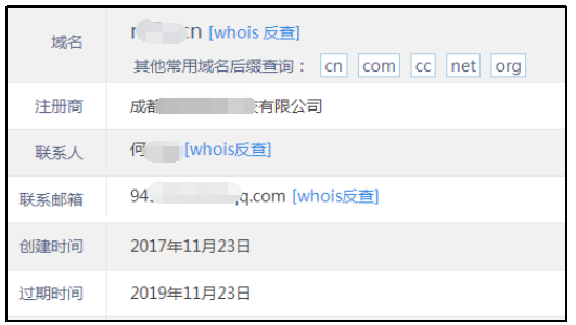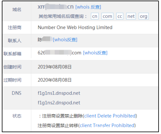 通过whois查询该域名的信息,可知其目前注册人为陈**,邮箱为62***418@qq.com,注册时间为2019年8月8日。