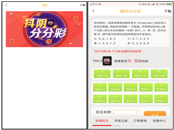 部分程序中存在在线赌博内容,以“腾讯分分彩”游戏为例,该赌博游戏声称以QQ实时在线人数的末尾数为开奖结果,用户猜中可以获取到对应赔率的奖励。