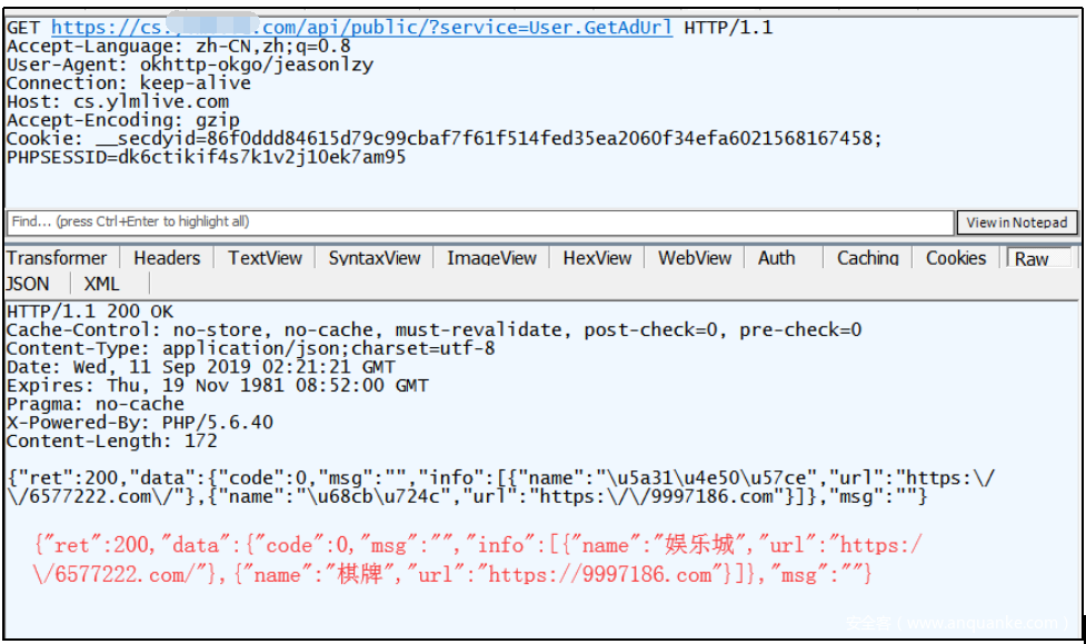 这几个域名中大部分都不可访问,其中yw**ui.cn可以访问,是一款名为“趣聊”的APP服务器,该应用未见其他恶意行为,其下载地址为http://y**ou.cn/趣聊.apk。