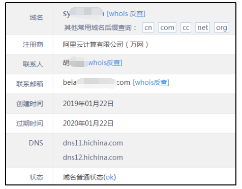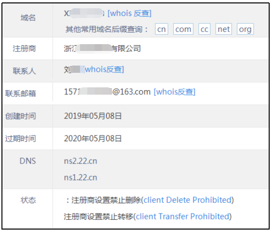 通过whois查询可知,域名的注册人为刘*,联系邮箱为1571****256@163.com,可以推测邮箱的前缀1571****256为一个手机号。