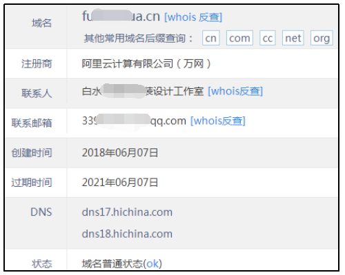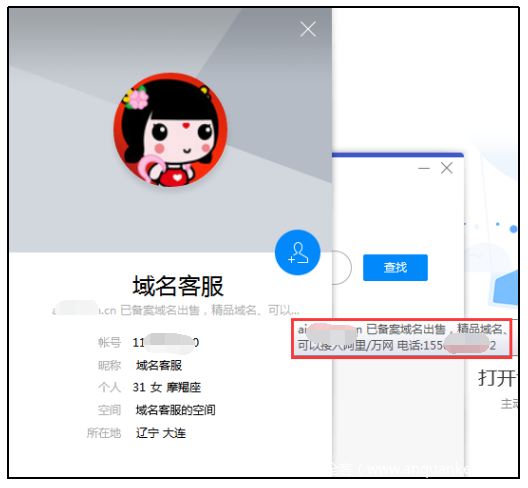 通过QQ账号可知,该域名也被域名商掌握,其网站为a**i.com.cn,电话为1558***4772。