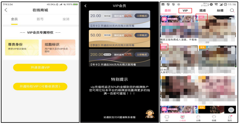 程序对普通用户可以观看的视频等内容进行了限制,将一些更具诱惑的视频设置为VIP专属,诱导用户充值VIP。