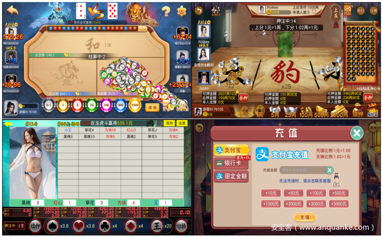 程序提供了在线赌博功能,提供多种类型的赌博形式,用户可以进行充值押注,但往往程序可以控制开牌结果。