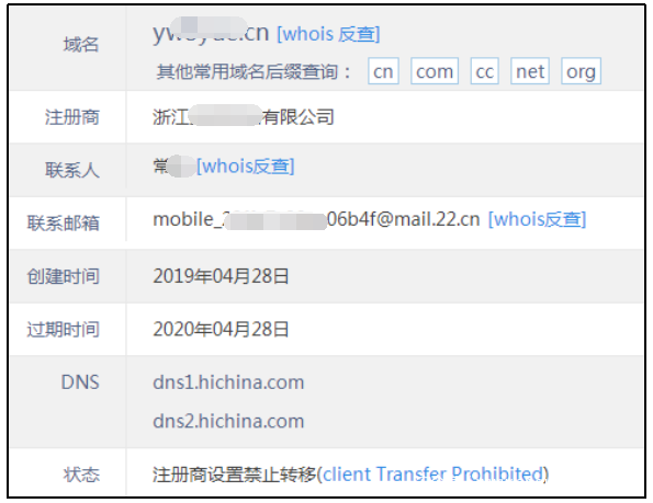 通过whois域名查询,可知该域名的联系人为常*,联系邮箱为mobile_23ffa****06b4f@mail.22.cn,根据联系人和联系邮箱,未反查到其他信息。