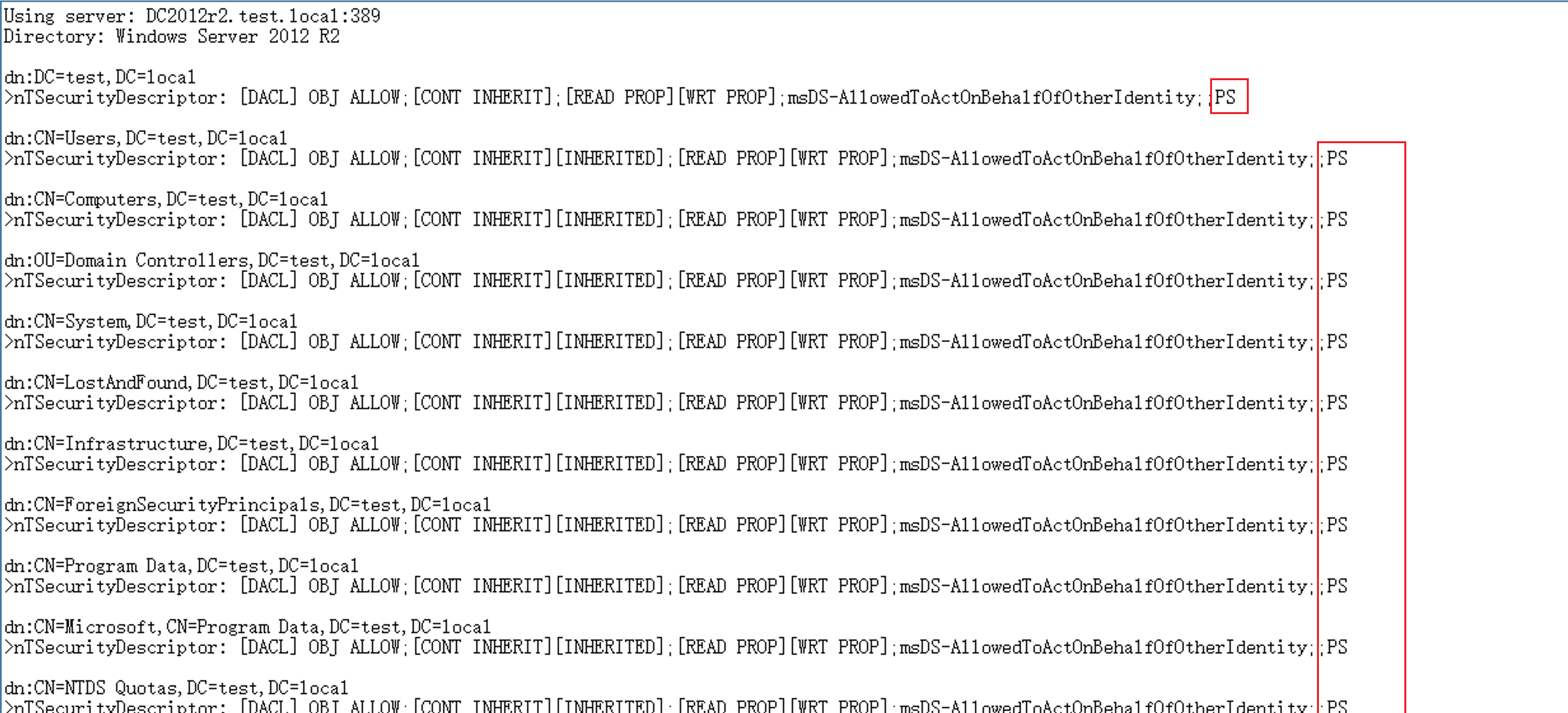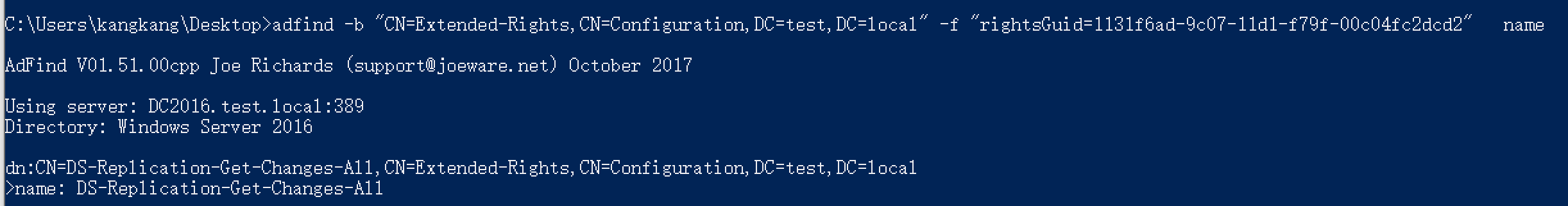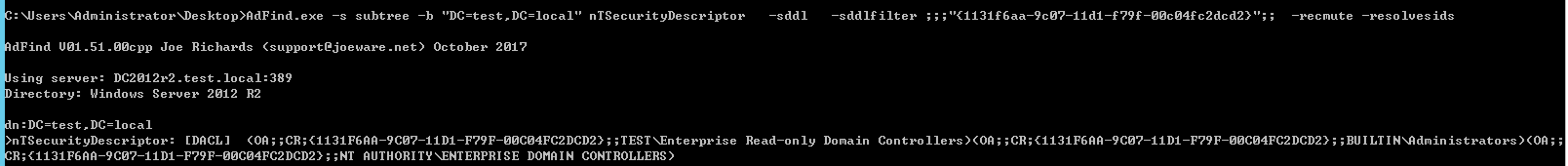 AdFind.exe -s subtree -b "DC=test,DC=local" nTSecurityDescriptor -sddl+++ -sddlfilter ;;;;;"TEST\DC2016$" -recmute - 查找更改一个对象的马上到!S-AllowedToActOnBehalfOfOtherIdentity的权限