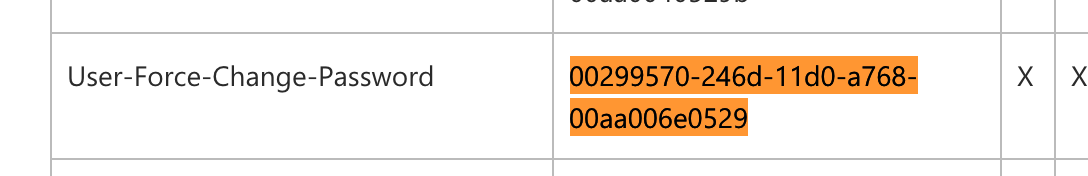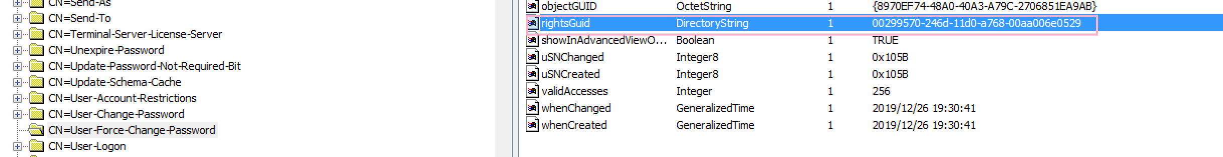 我们可以看到主要是多了个GUID(00299570-246d-11d0-a768-00aa006e0529),我们查下这个GUID(00299570-246d-11d0-a768-00aa006e0529)是强制更改密码,因此这个权限是扩展权限,强制更改密码。