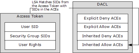 大体的流程是。当对象A来访问B的时候,A会出示自己的Access Token,然后包含自己的用户sid,自己所在的组的sid,以及特权列表。B这个安全对象,有自己的ACL。