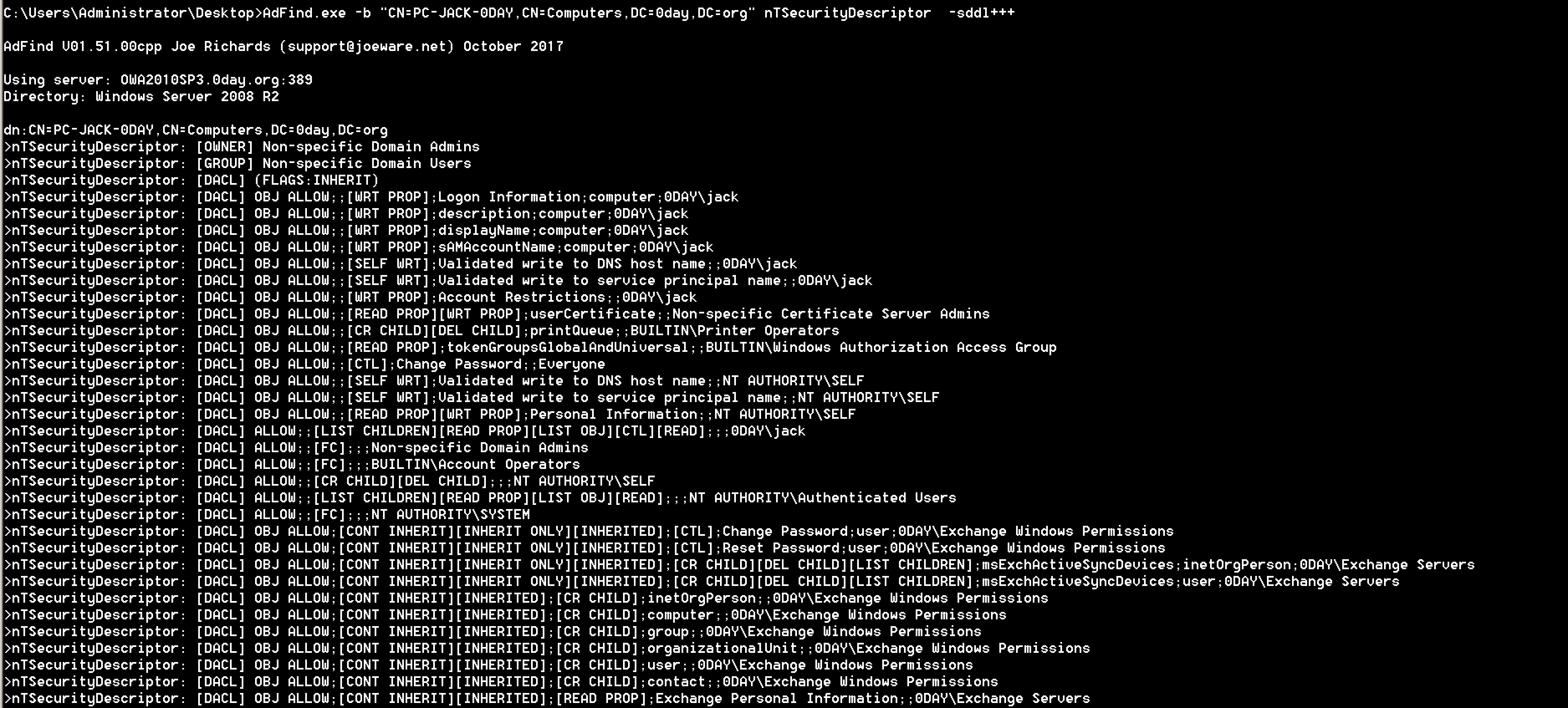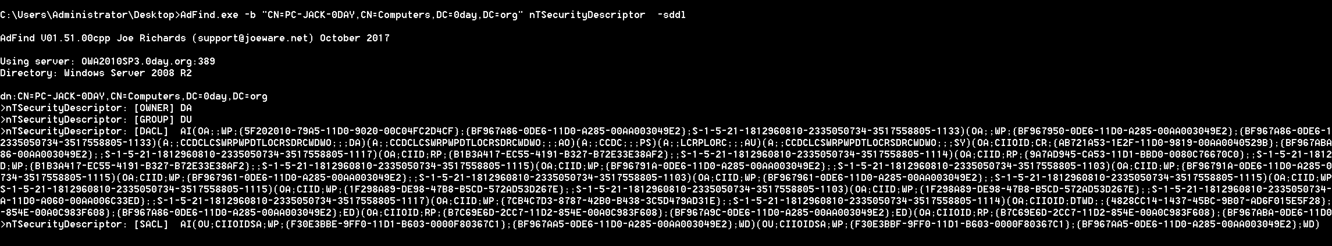 AdFind.exe -b "CN=PC-JACK-0DAY,CN=Computers,DC=0day,DC=org" nTSecurityDescriptor -rawsddl