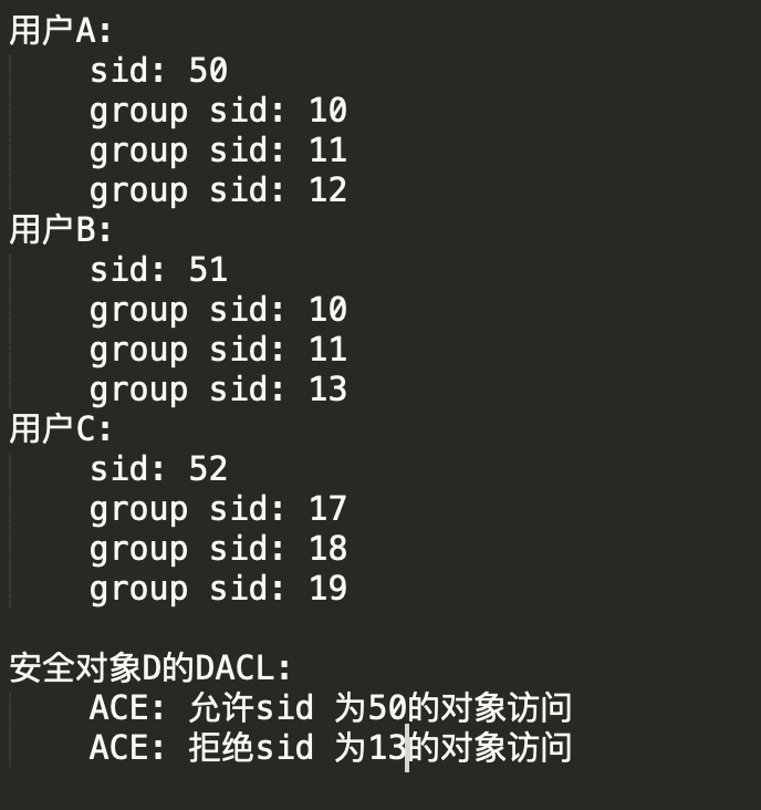 D 查看B的用户sid,以及组sids。首先到第二条进行匹配,拒绝sid 为13的对象访问,发现B 的其中一个组sid 为13,拒绝B访问。