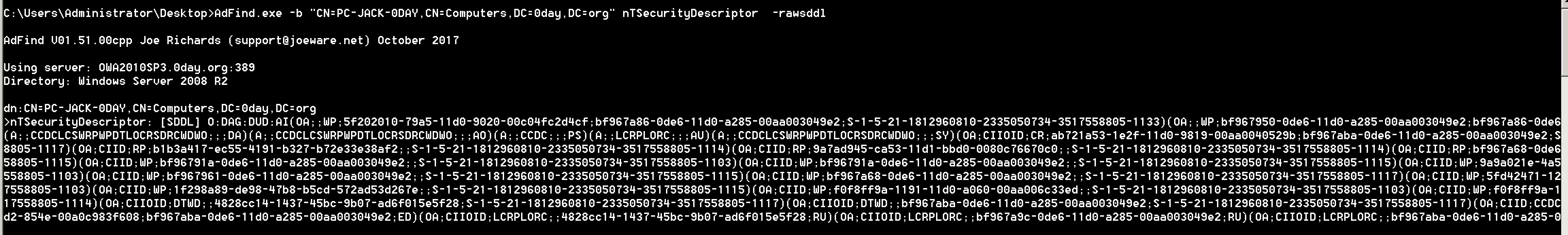 AdFind.exe -b "CN=PC-JACK-0DAY,CN=Computers,DC=0day,DC=org" nTSecurityDescriptor -sddl
