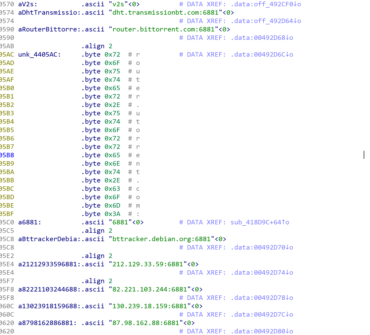 分析过程中发现Mozi僵尸网络复用了部分Gafgyt家族僵尸网络的代码,其中内嵌了8个硬编码的公共节点信息,用于加入P2P网络,如下: