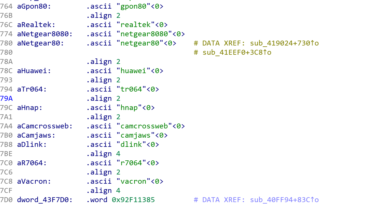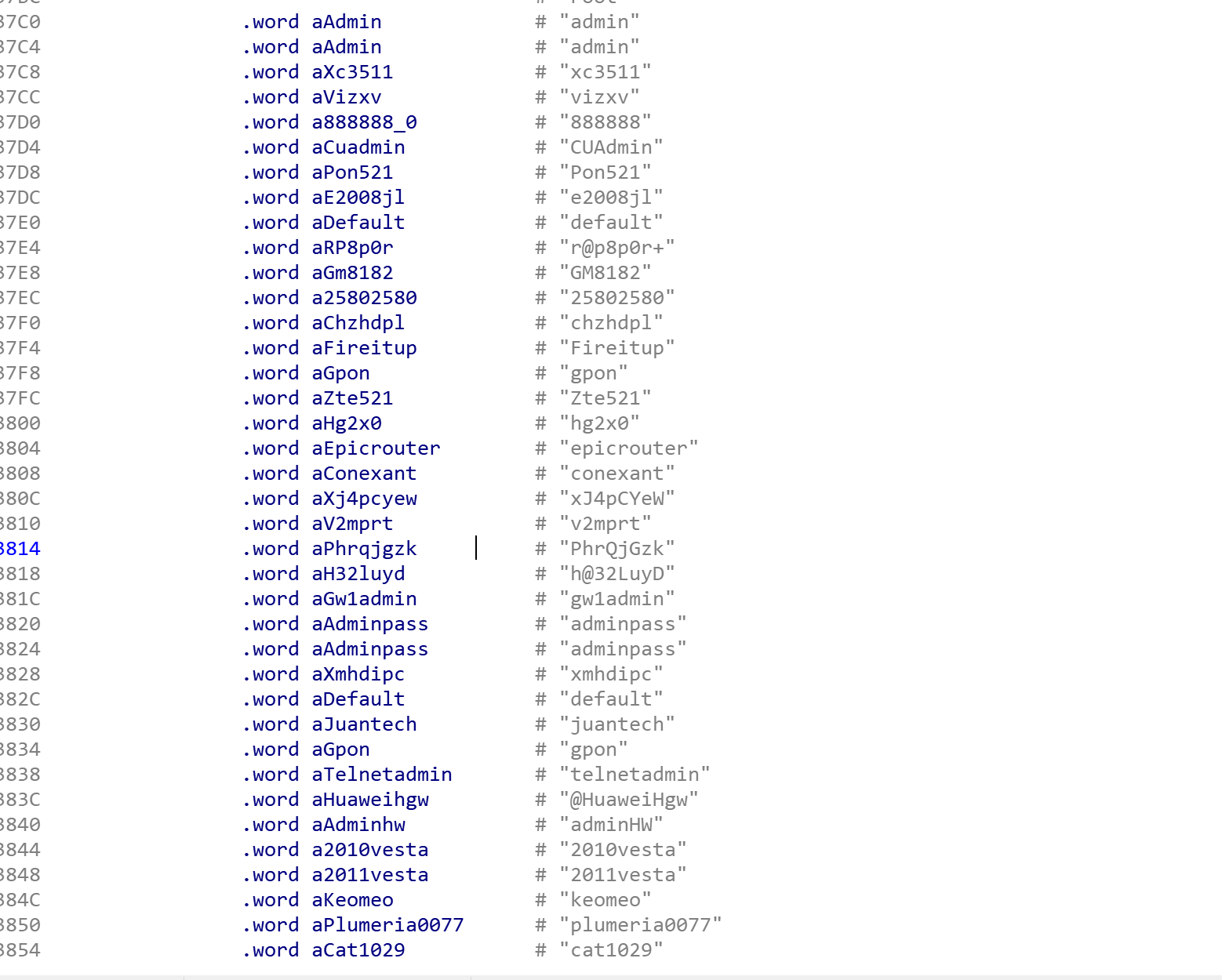 同时还在样本中发现硬编码的部分用户名和弱口令,用来对Telnet进行暴力破解攻击,以扩大感染和传播范围,硬编码的部分用户名和密码如下: