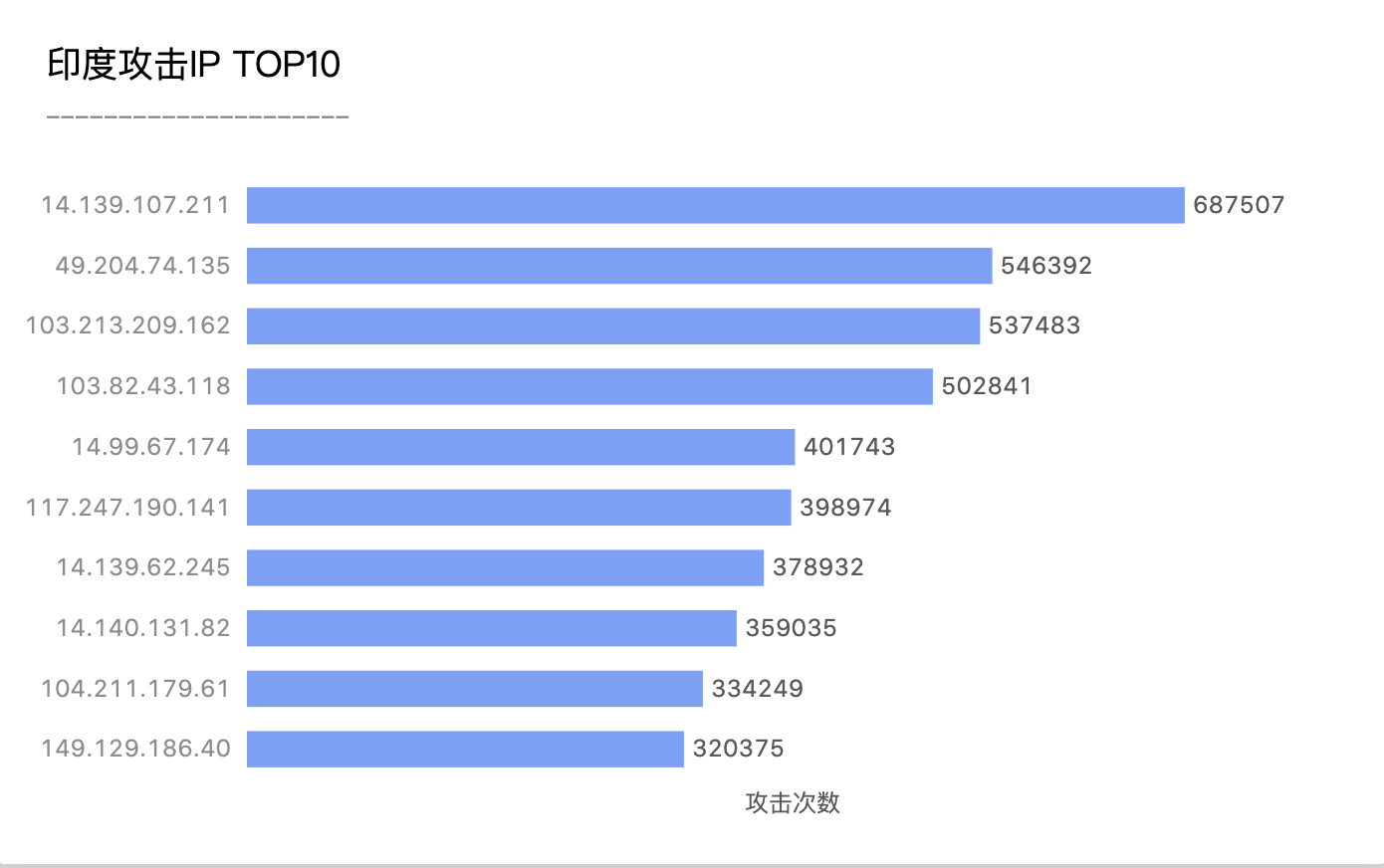 自9月以来知道创宇云防御共拦截了来自Mozi僵尸网络的151,952个IP的攻击,总计拦截攻击14,228,252次。与8月份相比,来自印度的攻击显著增加,拦截到的来自印度的攻击IP同比上涨了近30%,所拦截到的总攻击次数上涨了近42%。下图为知道创宇404积极防御实验室自9月以来监测到的来自印度的攻击IP TOP10: