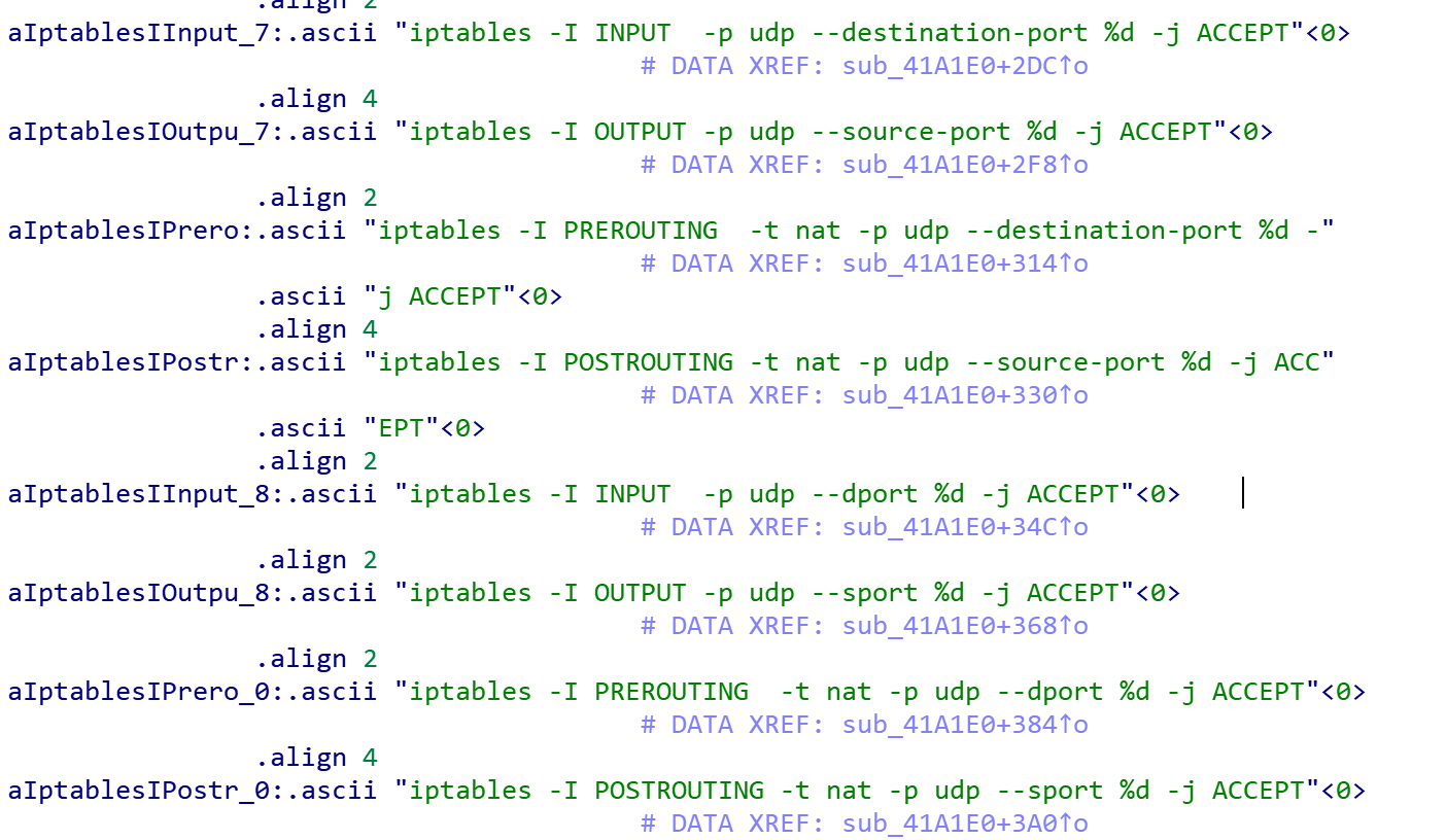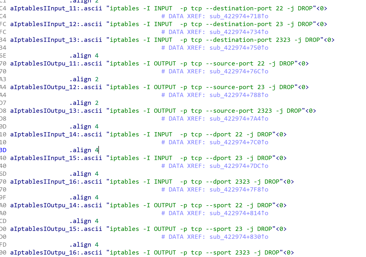 在成功感染目标设备之后,Mozi为进行自我保护,会通过防火墙阻断SSH、Telnet端口,以防止被其他僵尸网络入侵: