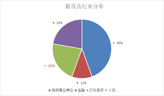 通过对捕获到的日志分析,对所有被攻击的行业进行分类统计,其中被攻击占比最高的为政府事业单位,以及部分部委机关系统及网站。这部分系统在所有被攻击的行业中占比达到45%。如下: