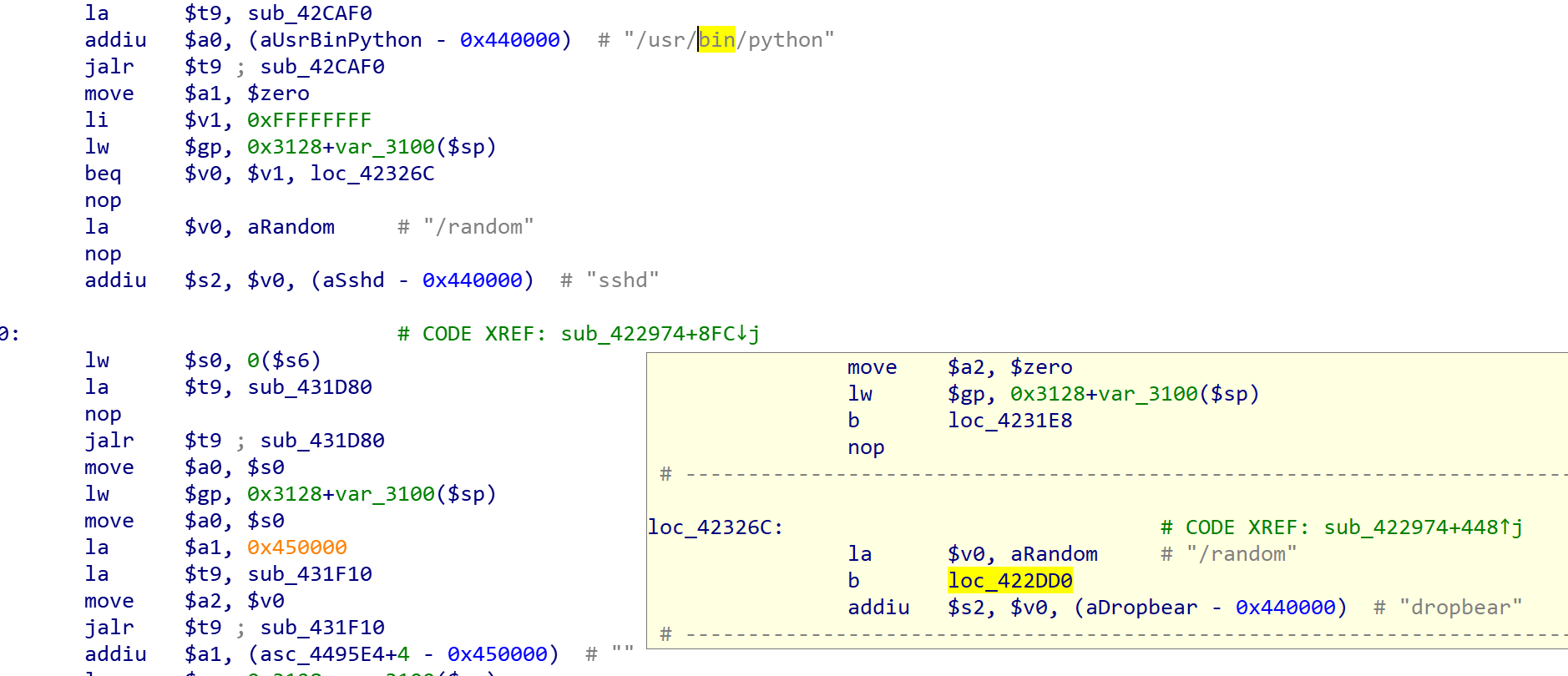 检查被感染的设备上是否存在/usr/bin/python,如果存在,则将进程名称更改为sshd,不存在则更改为dropbear,以此来迷惑被攻击者。
