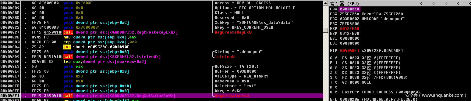 若这两个注册表项均不存在,则先创建HKLM(HKCU)SOFTWAREex_datadata项,并生成ext子项中存储此次勒索后缀。