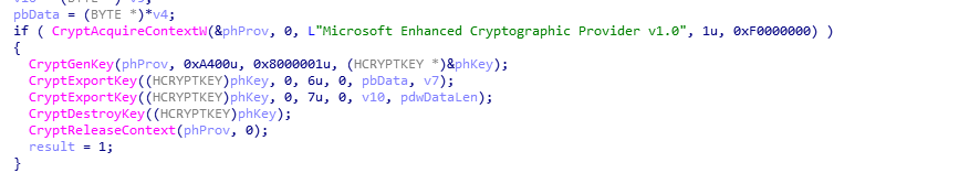 使用CryptGenKey及CryptExportKey生出并导出公私密钥对,并查找注册表HKCUSOFTWAREkeys_datadata及HKLMSOFTWAREkeys_datadata两项,作者检查HKCU及HKLM为确保样本在非管理员权限以上启动也可正常写入注册表