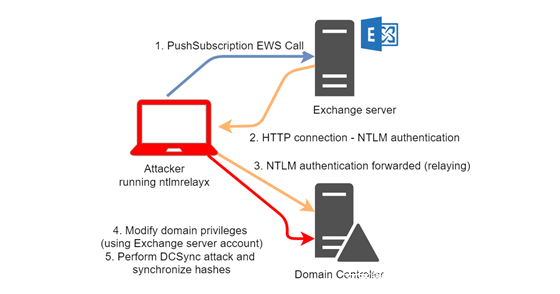 Exchange允许任何用户为推送订阅指定所需的URL,服务器将尝试向这个URL发送通知。问题出在Exchange服务器使用CredentialCache.DefaultCredentials进行连接。传进的URL我们可控,也就说我们可以控制Exchange服务器向我们发起HTTP 协议的NTLM 请求。我们就能拿到Exchange机器用户的 Net-Ntlm Hash。如图中的步骤1,步骤2所示。