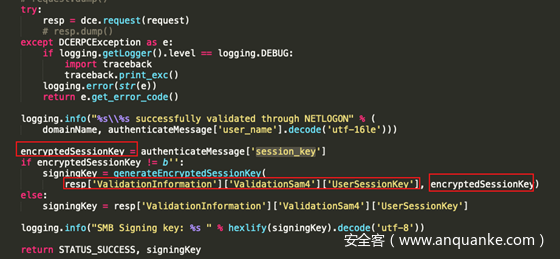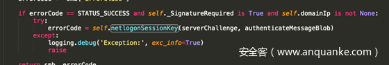 之前的文章说过,在域内进行NTLMRELAY的时候,如果登录的用户是域用户,这个时候认证服务器本地是没有域用户的hash的,这个时候会通过NETLOGON把type 1,type 2,type 3全部发给域控,让域控去判断。并不是向域控索要域用户的hash。那在认证之后,由于没有用户的hash,也没有办法算出keyexchangekey,这个时候认证服务器就会通过NETLOGON去找域控索要keyexchangekey。从而算出exportedsession_key。