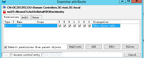 我们考虑另外一种情况,当发起者是域管用户的时候,这个时候别看是域管机器,但是权限真的并不高。首先,他并不在域管组里面。其次,他能控制的acl也并不多。在 Windows内网协议学习NTLM篇之Net-NTLM利用里面我们介绍了三种通用的漏洞利用思路,前两种在这种情况下,在这里并不适用,在server2012r2,我们可以通过设置基于资源的约束委派。在域管机器属性msDS-AllowedToActOnBehalfOfOtherIdentity里面添加一条ace,可以让任何机器用户和服务用户可以控制该用户(NTLM发起者),虽然不能直接登录,但是因为该机器是域管机器,我们可以进行dcync。