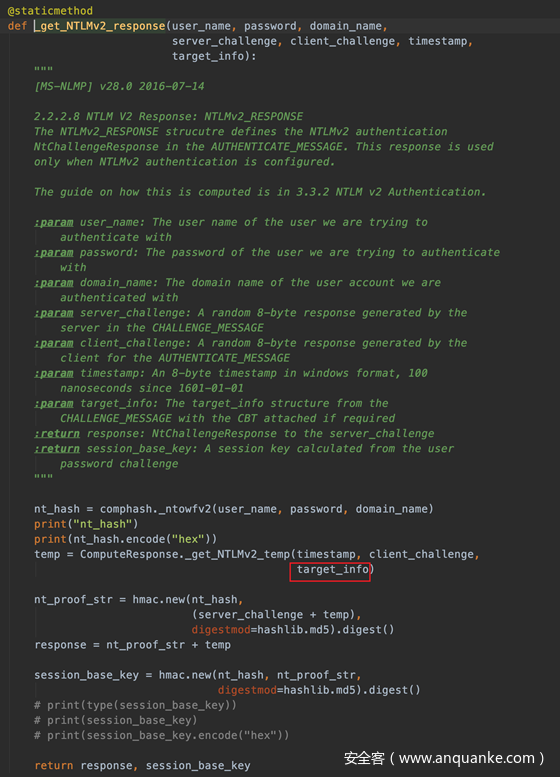 由于在计算Reponse的时候,该targetInfo参与Reponse的计算。(关于Response计算的更多细节可以此参考Windows内网协议学习NTLM篇之NTLM基础介绍)