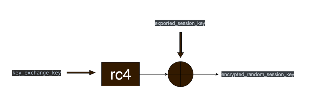 前面说过开启签名的话,客户端是使用exportedsessionkey做为key进行加密解密的,而exportedsessionkey是客户端生成的随机数,那服务端不知道这个key。这个时候就需要协商密钥。encryptedrandomsessionkey的生成如下图所示,使用keyexchangekey做为Key,RC4加密算法加密exportedsessionkey。