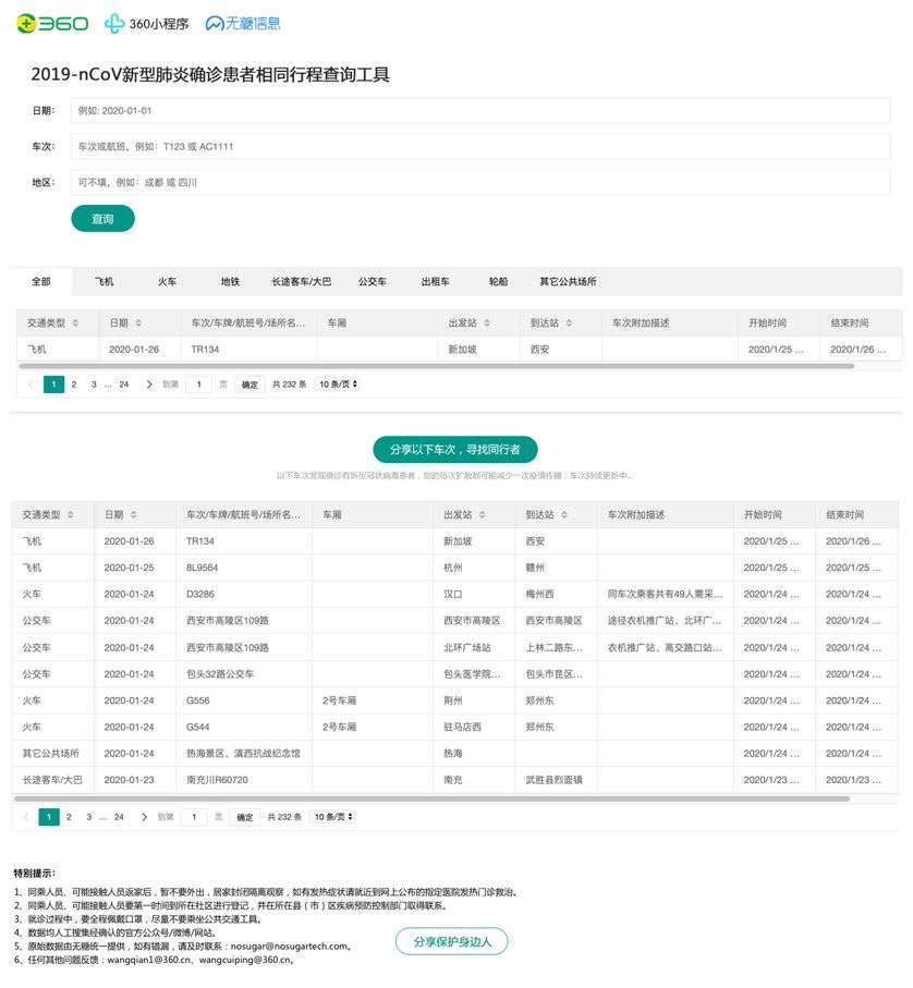 360集团与成都无糖信息技术有限公司(以下简称“无糖信息”)合作,经过短短几日夜奋战,联合开发上线“新型冠状感染性肺炎确诊患者同行”查询系统,用户输入行程日期、车次和地区,即可查询是否为已披露有新型肺炎确诊患者同行的火车、飞机和地铁。