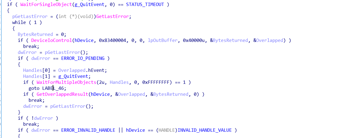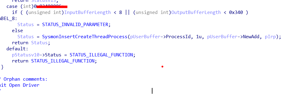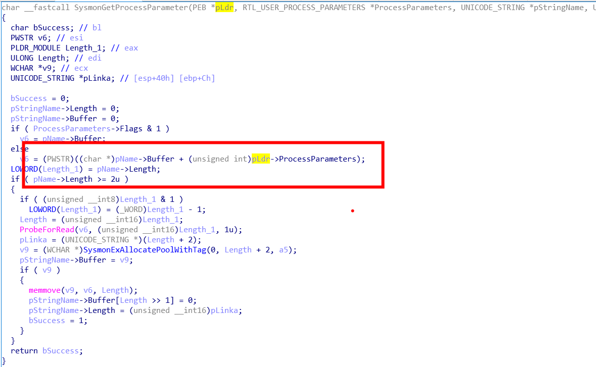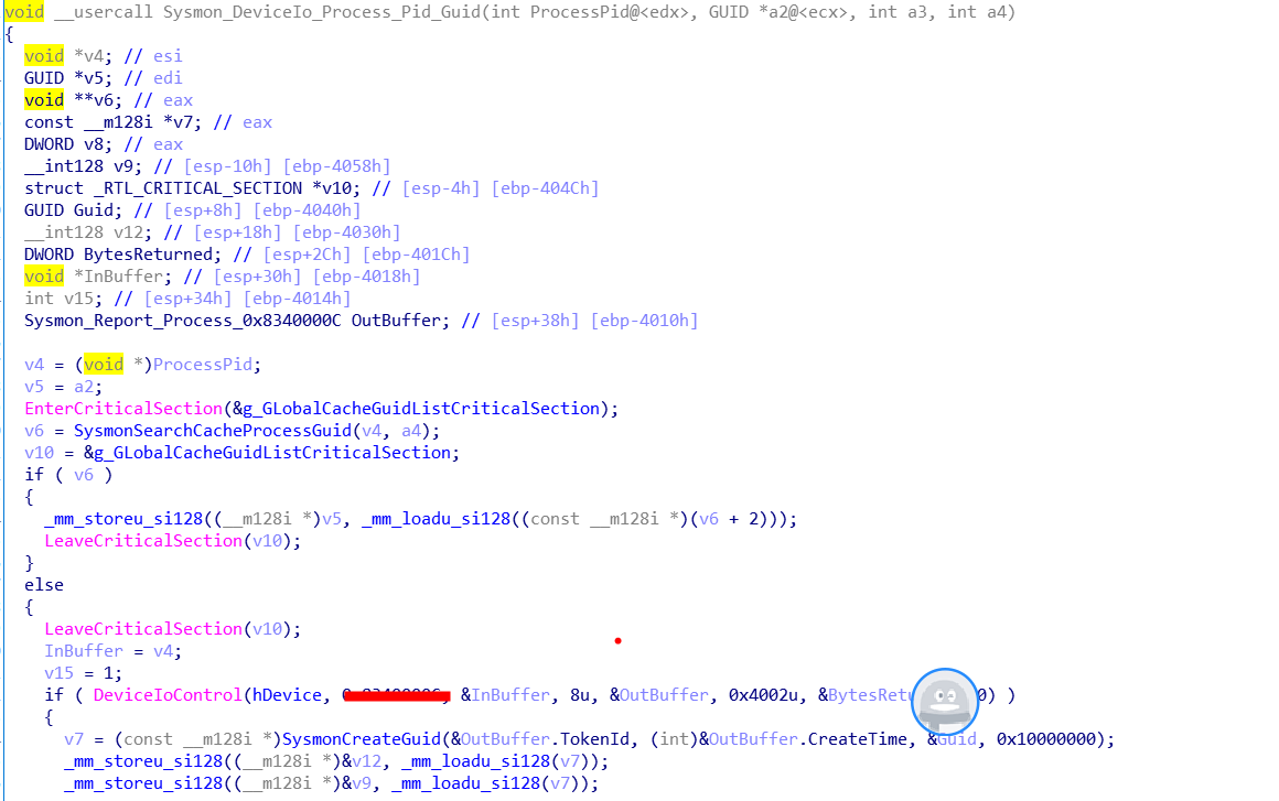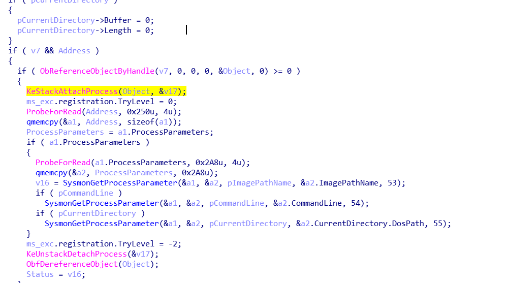 if (SUCCEEDED(DeviceIoControl(hObjectDrv, SYSMON_REQUEST_PROCESS_INFO, &Request, 8, OutBuffer, sizeof(OutBuffer), &BytesReturned, 0))) {