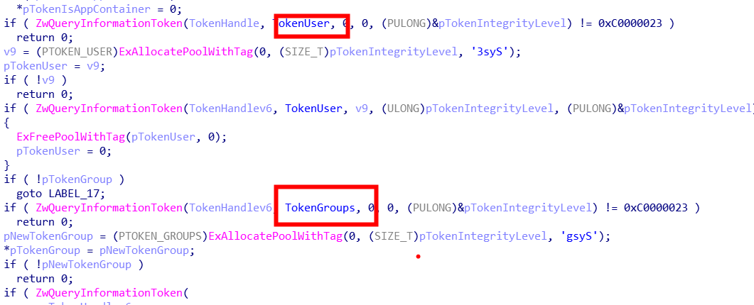 然后Query句柄,使用ZwQueryInformationToken函数去获取,TokenInfomationClass分别是TokenUser、TokenGroups、TokenStatistics、TokenIntegrityLevel。最后会把这些信息输出到传输的缓冲区结构体里