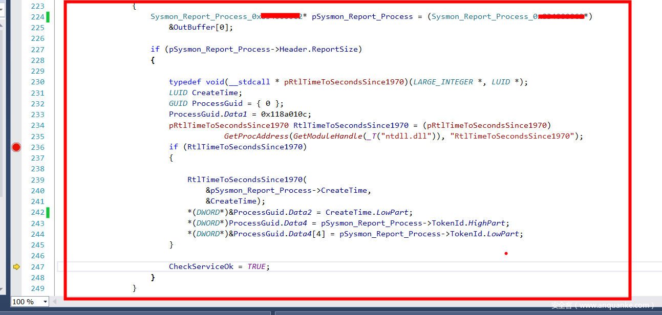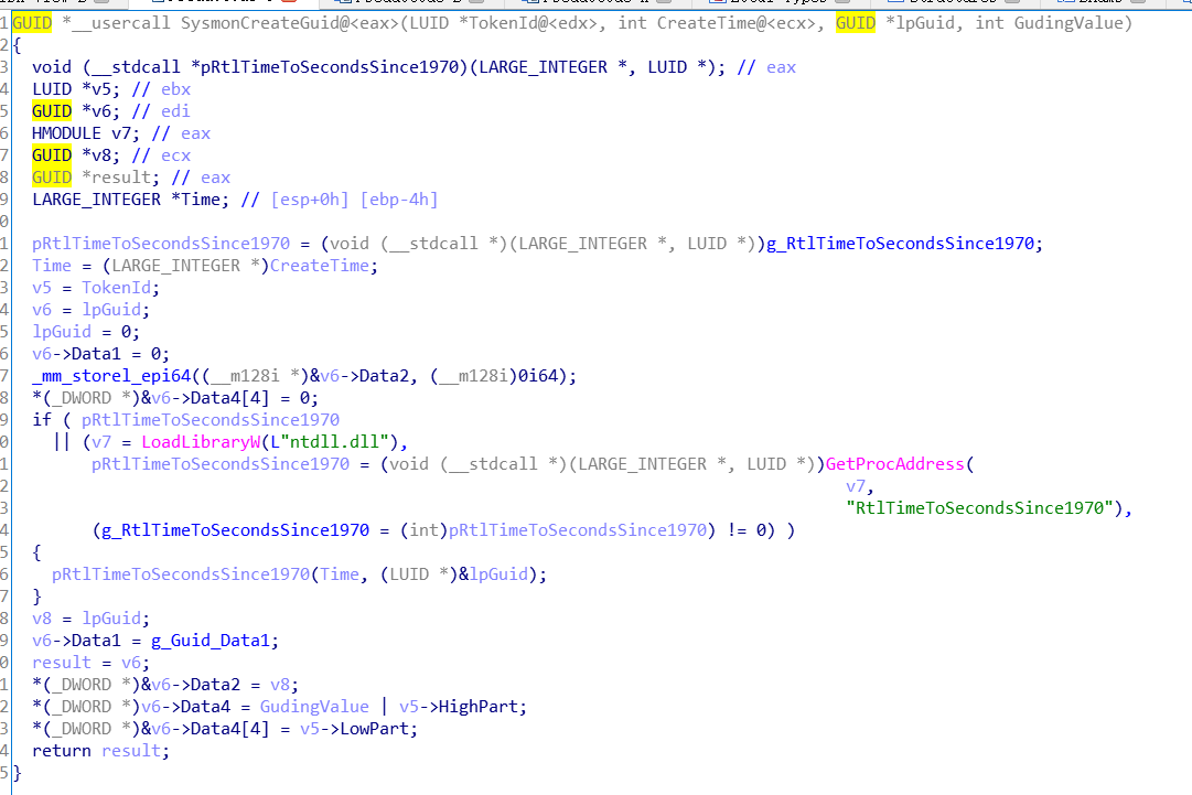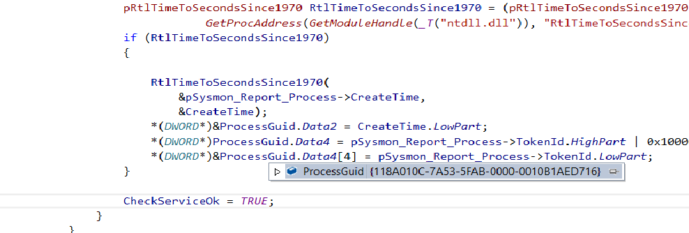 RtlTimeToSecondsSince1970( & pSysmon_Report_Process - >CreateTime, &CreateTime); * (DWORD * ) & ProcessGuid.Data2 = CreateTime.LowPart; * (DWORD * ) ProcessGuid.Data4 = pSysmon_Report_Process - >TokenId.HighPart; * (DWORD * ) & ProcessGuid.Data4[4] = pSysmon_Report_Process - >TokenId.LowPart;