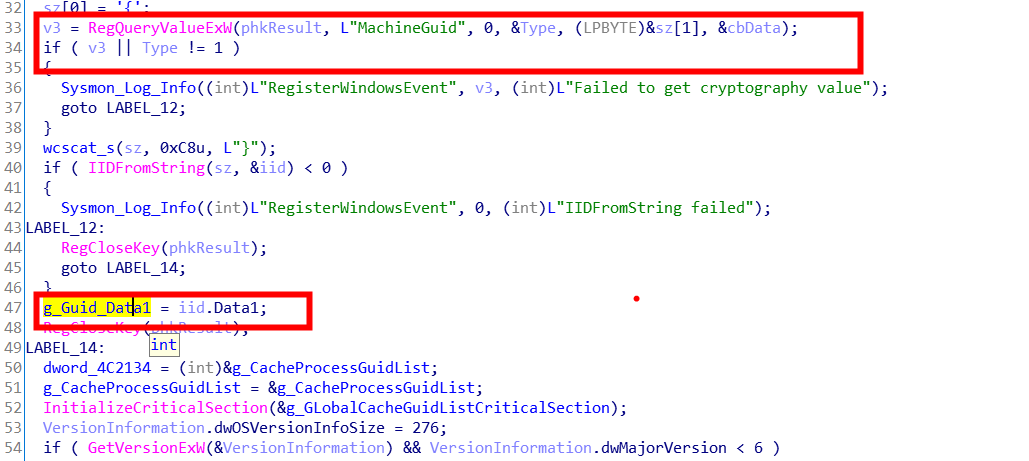 可以看到读取注册表键值为MachineGuid的键值获取这个键值Guid的第一个Data1给g_Guid_Data1,网上翻阅,会看到