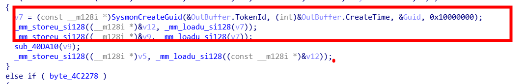 可以看到函数v7 = (const __m128i *)SysmonCreateGuid(&OutBuffer.TokenId, (int)&OutBuffer.CreateTime, &Guid, 0x10000000);传入的参数是TokenId、CreateTime