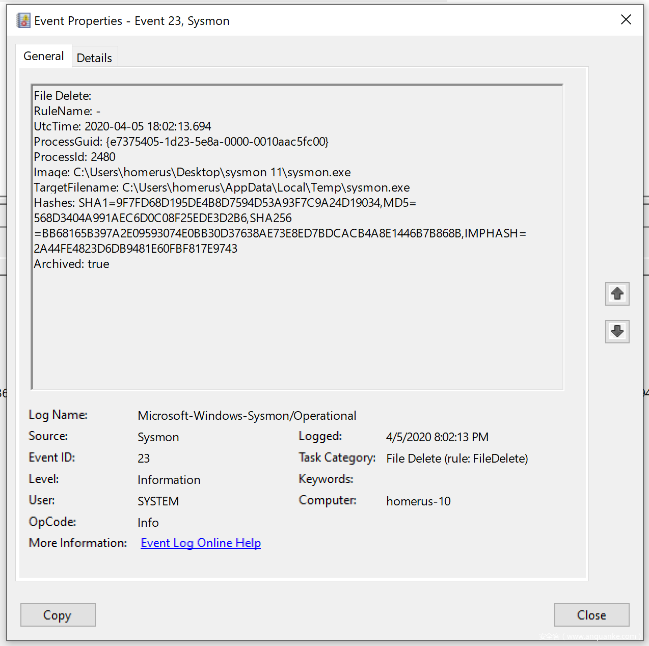 Sysmon的众多事件看起来都是独立存在的,但是它们确实都是由每个进程的产生的,而关联这些信息的东西正是ProcessGuid,这个对进程是唯一的。如下图