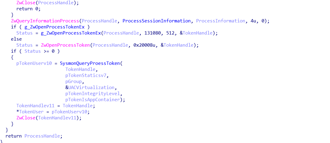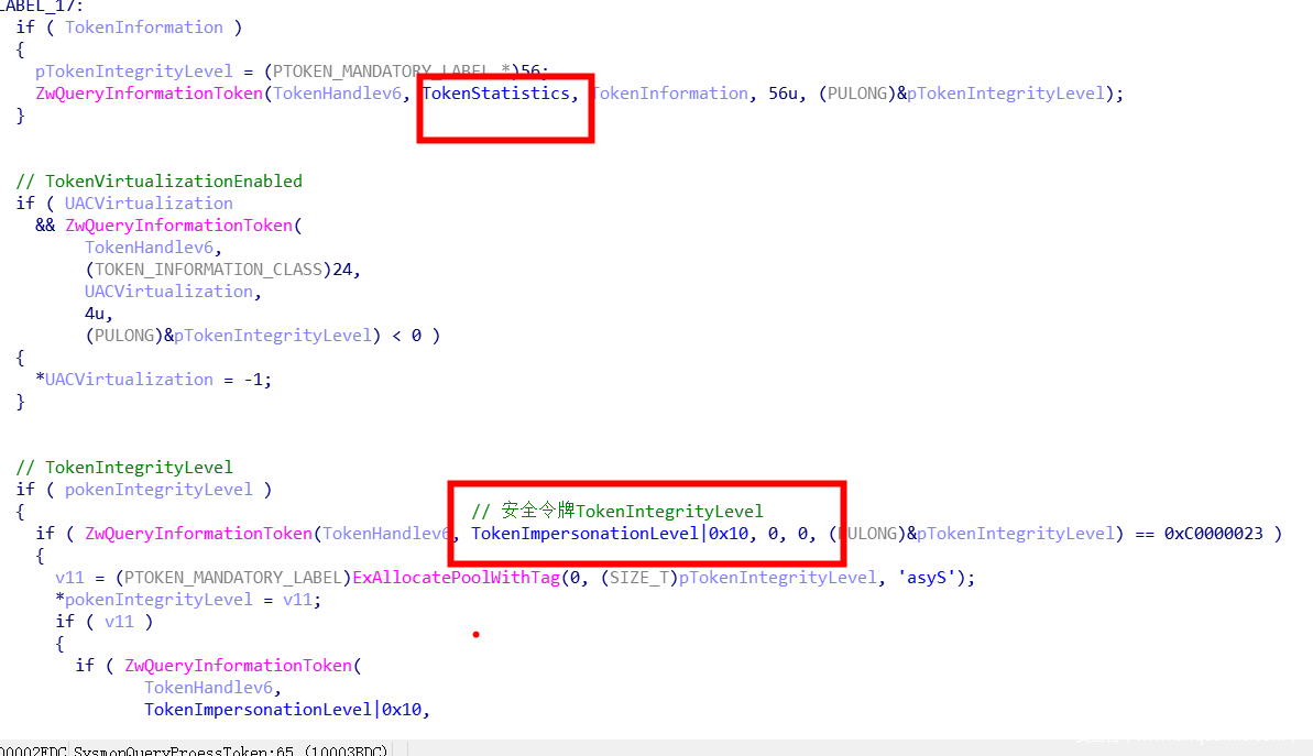 在这里函数里使用了ZwOpenProcessToken(ProcessHandle, 0x20008u, &TokenHandle);去获取进程token句柄