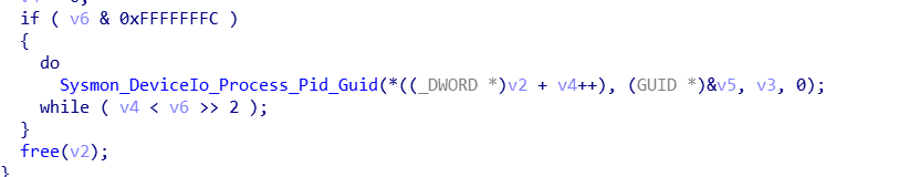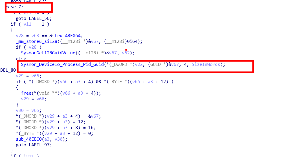 事件类型为7的时候,同样会调用以上函数Sysmon_DeviceIo_Process_Pid_Guid((_DWORD )v22, (GUID *)&v67, 4, SizeInWords);去生成ProcessGuid,事件类型7 就是我们上一篇文章讲的进程线程事件。