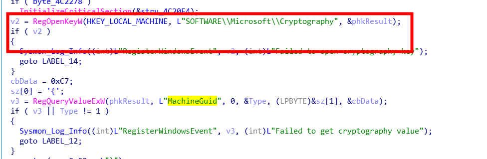 v2 = RegOpenKeyW(HKEY_LOCAL_MACHINE, L”SOFTWARE\Microsoft\Cryptography”, &phkResult);