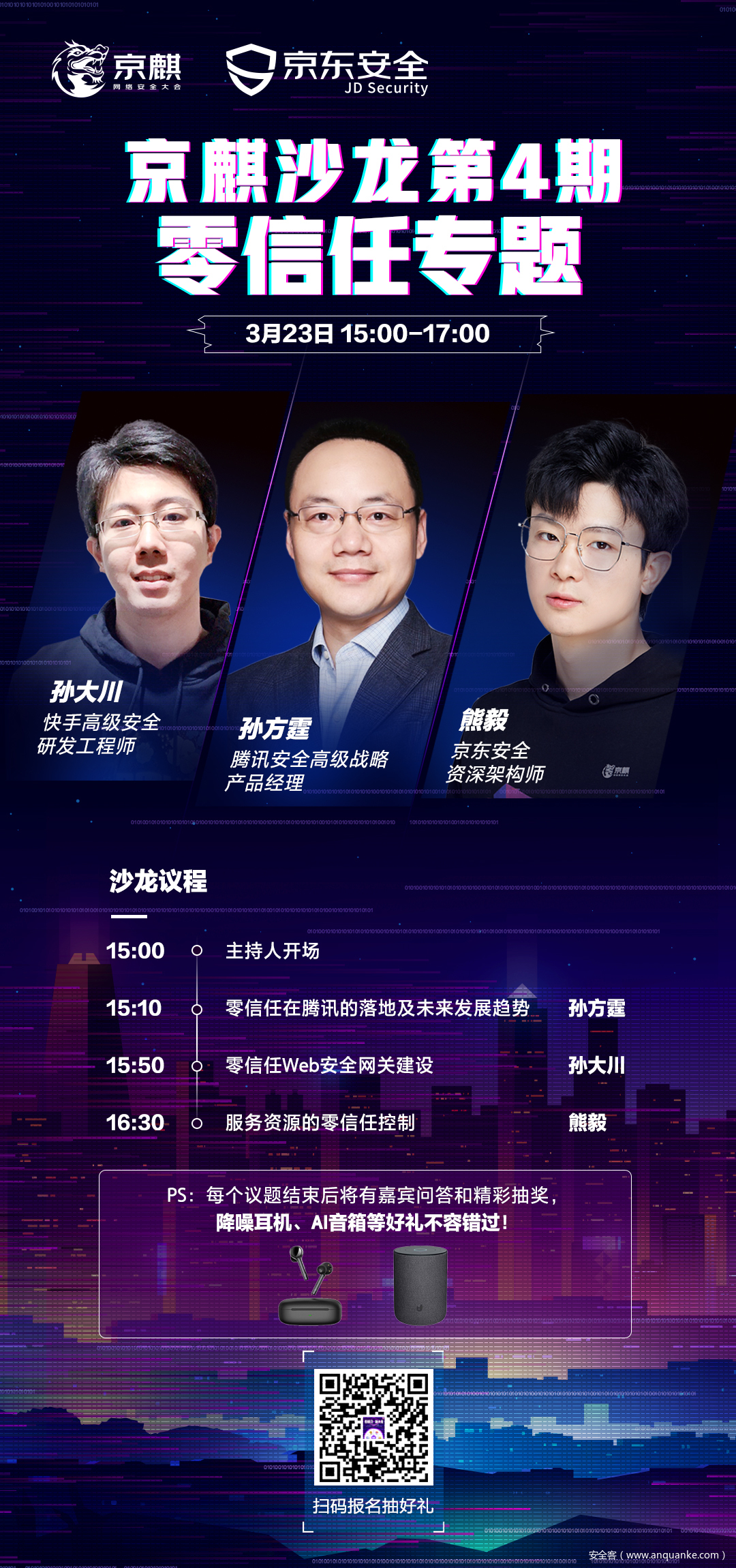 3月23日15:00-17:00,京麒沙龙系列的第4期——零信任专题,我们邀请到腾讯、快手、京东在零信任领域的安全专家们,线上与大家共同探讨零信任实践的产品和技术,以及在公司落地过程中的难题和应对策略,希望能够通过本次分享和交流经验,给业界带来借鉴意义。