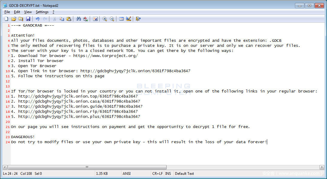 当GandCrab加密完受害者机器上的文件之后,受害者机器上会出现一个名为GDCB-DECRYPT.txt的文件。GDCB-DECRYPT.txt文件内容会告知受害者当前系统上的文件已被加密,并且提供了一份网关列表让受害者可以通过Tor访问支付赎金的网址。