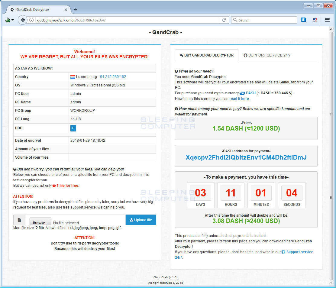 当受害者打开支付赎金的链接,会访问一个名叫“GandCrab Decryptor”的页面,这个页面上会由赎金的数量、付款的达世币(DASH)地址和一份解密过的文件。前面已经说过,目前还没有免费的方法解密由GandCrab加密的文件。